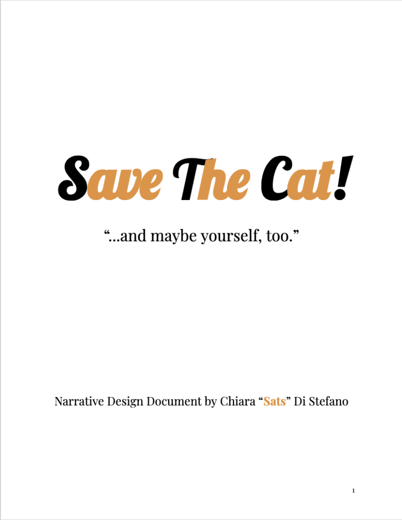 My goal for Save The Cat was to create and polish a Narrative Design Document including general plot, boss barks, and original mechanics. At the same time, I wanted to come up with a fun, campy adventure about being burnt out from a formerly beloved activity.