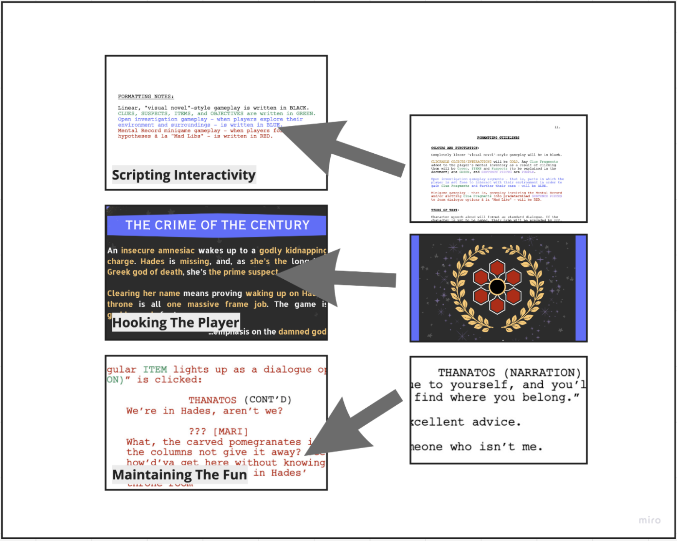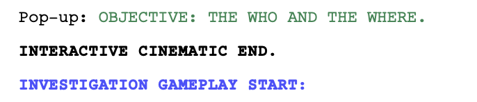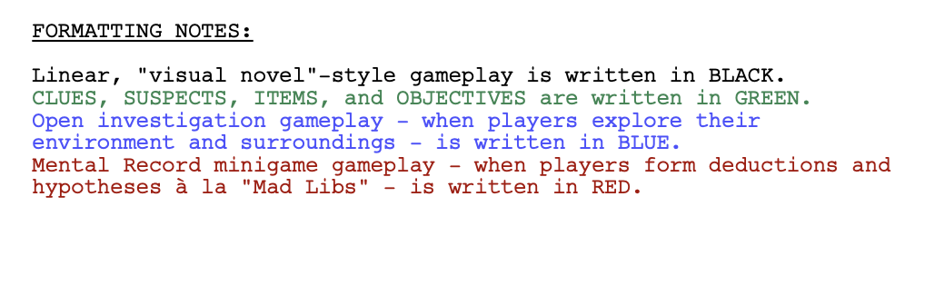 - Ideating Formatting: I’ll trim down my formatting into three simple gameplay segments (Interactive Cinematics, Investigation, and Mental Record Minigame) in order to keep the script legible.