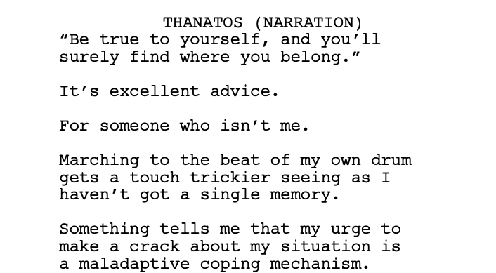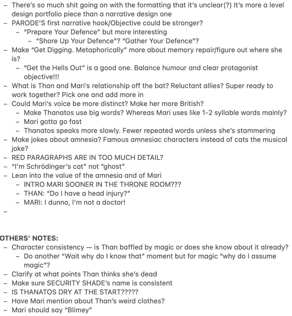 Throughout this process, I’ve sought regular feedback from Ariadna Martinez (Horizon Forbidden West), who helped guide me through the process of implementing formatting guidelines for my game scripting that actually make sense as well as making the script as tight as it could be.